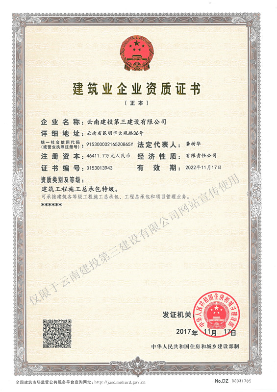 ??????????????????????云南建投第三建設有限公司具有建筑工程施工總承包特級資質、設計建筑行業甲級資質、機電設備安裝專業承包一級資質、消防設施工程專業承包一級資質、建筑裝修裝飾工程專業承包一級資質、市政公用工程施工總承包二級資質、鋼結構工程專業承包二級資質、公路工程施工總承包三級資質、人防防護通風工程...